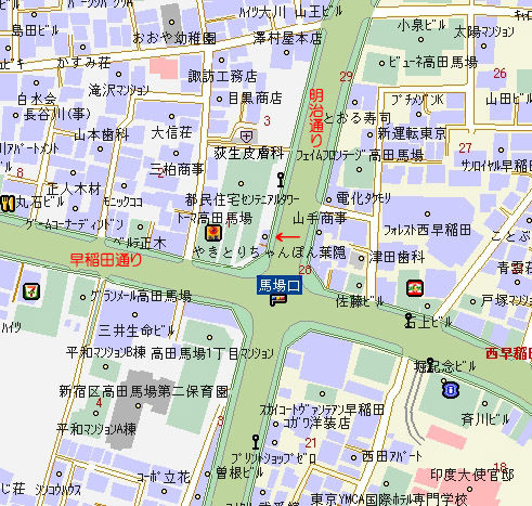 | 野歩の会OBGの皆様、ますますご健勝のこととお喜び申しあげます。 さて、先日ご連絡しましたとおり、10年あまり続いた「串亭飲み会」は9月1日をもって終了となりました。当日は久しぶりに10名参加という盛況でした。お世話になったヤマモト社長とゴトウさんに記念品をお渡しし、徳利など什器を頂戴してお別れしました。 そして次回からの例会は「葉隠(はがくれ)」という店に決まりました。「葉隠」第1回は10月6日午後7時です。ぜひお越し下さい。まだお馴染みというわけではありませんので手探りですが、先日串亭の帰りに寄ったかぎりではなかなか感じの良いお店です。繁盛しています。 「葉隠」の場所(下の写真と地図を参照ください) 高田馬場から早稲田通りを早稲田方面へ7〜8分、道の左側を歩く。 明治通りとの交差点(馬場口交差点)を『渡らずに』左、目白方向へ。 曲がってすぐ(たしか2軒目)です。 葉隠では、まだ「野歩の会」という名前は定着していないので、「イワブチ先生の紹介で予約してあるはずです」と言ってください。多分2階の小部屋に通されます。当日は「秋の山行」が話題になると思います。 |