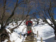 急階段を登って、茅場平ではじめて雪混じりの路面となりました。泥んこなので、ここでスパッツ着用です。この先、前岩・小岩・大岩(私が命名しました)とガレ場が続き、雪で埋もれた天国への階段(同・命名)を登りきれば花立山荘です。相模湾、東京方面の眺望は秀逸です。