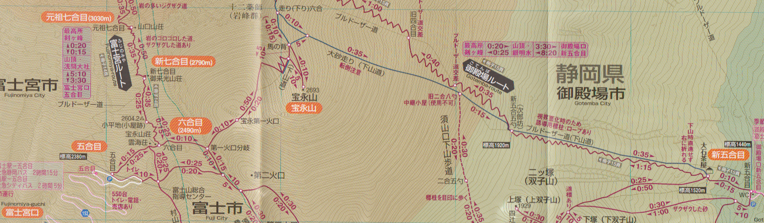 富士宮口新五合目の標高は2400メートル、宝永山は2700メートル、御殿場ルートとの合流点は