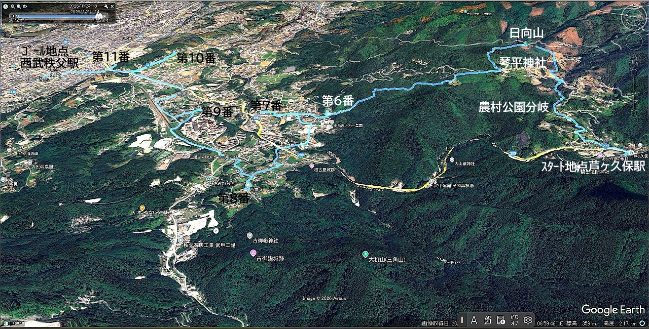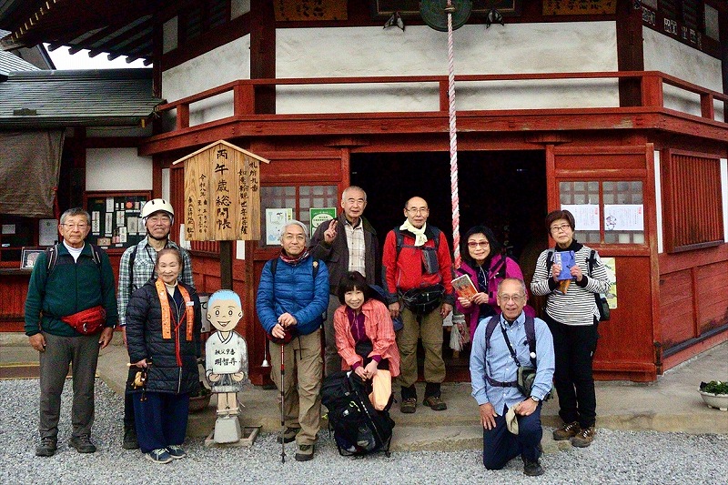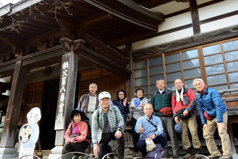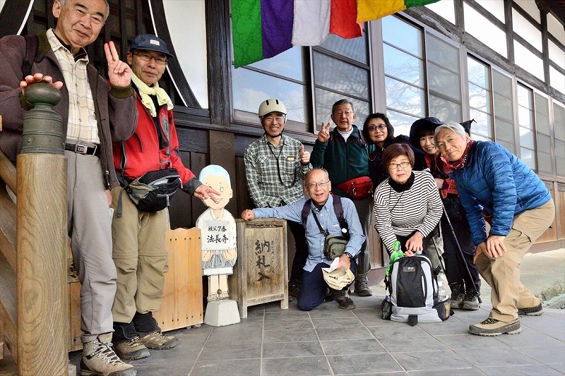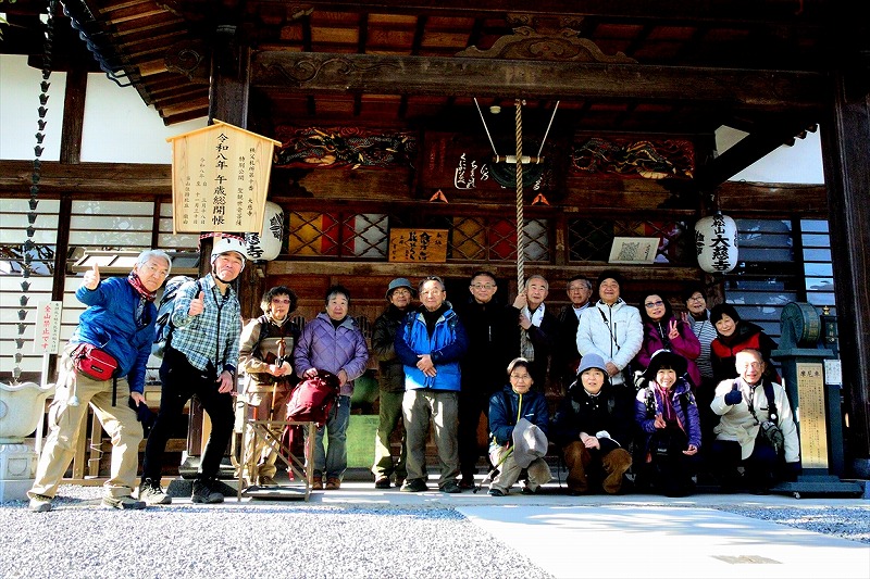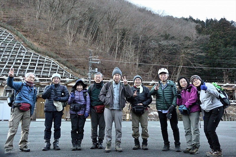 7:55着の電車で全員集合。駅前は日陰で寒い。駅前で全員で集合写真を撮影して出発。