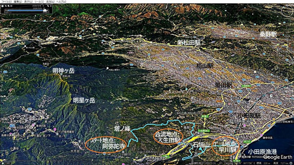 JR早川駅に到着し、無事に全員が完歩。タクシーを駆使した効率的な行程と、新たなメンバーとの合流、そして箱根の峻厳さと海辺の穏やかさが交差する、実に内容の濃い一日となりました。春の訪れを全身で感じた、思い出深い山行記録です。