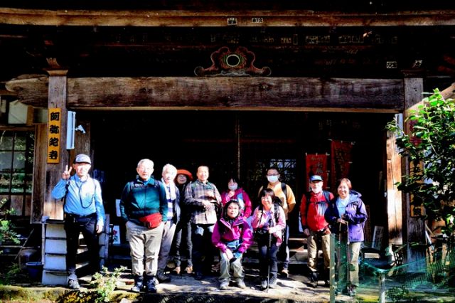 旅の始まりは小田原駅西口。本格ハイク班13人は高度を稼ぎ効率よく登るため、ここからタクシー4台に分乗し、塔ノ沢の阿弥陀寺を目指します。阿弥陀寺へと続く道は非常に狭く、運転手の熟練したハンドルさばきに身を任せながら、標高287mの駐車場へと到着しました。<阿弥陀寺本堂前>